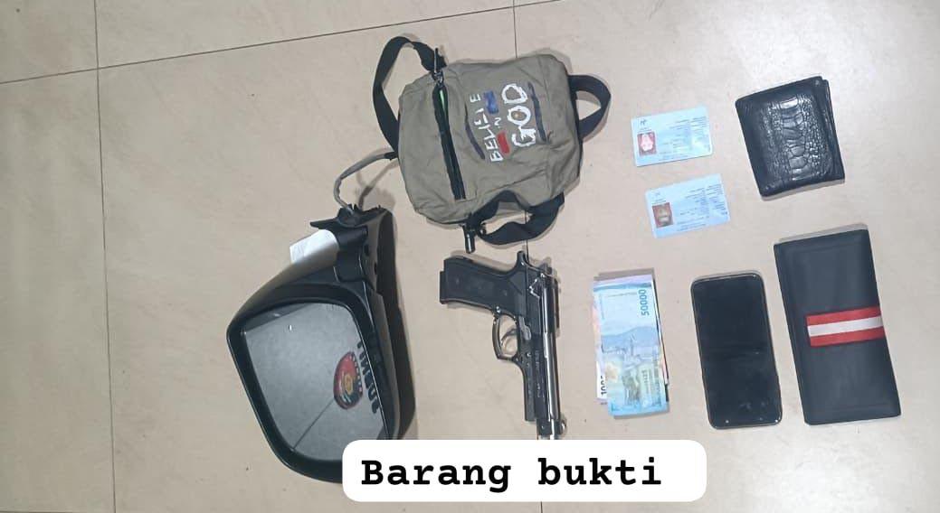 Dari tangan pelaku, polisi menyita sejumlah barang bukti antara lain kaca spion mobil Toyota Fortuner warna hitam, satu unit sepeda motor Honda Beat, satu unit telepon genggam, korek api berbentuk pistol mainan, tas selempang, dompet panjang dan dompet kecil, STNK mobil Fortuner, serta rekaman CCTV di sejumlah titik sekitar TKP.