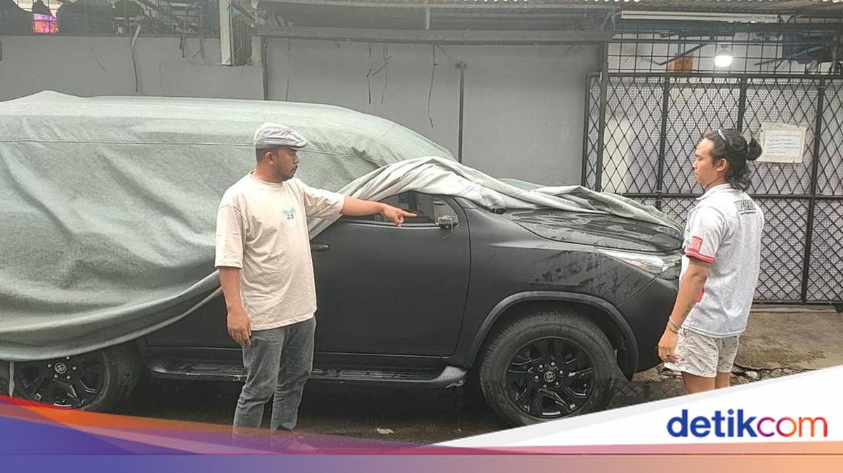 Pelaku tampak melepas spion kanan mobil Fortuner. Keduanya kemudian langsung melarikan diri.